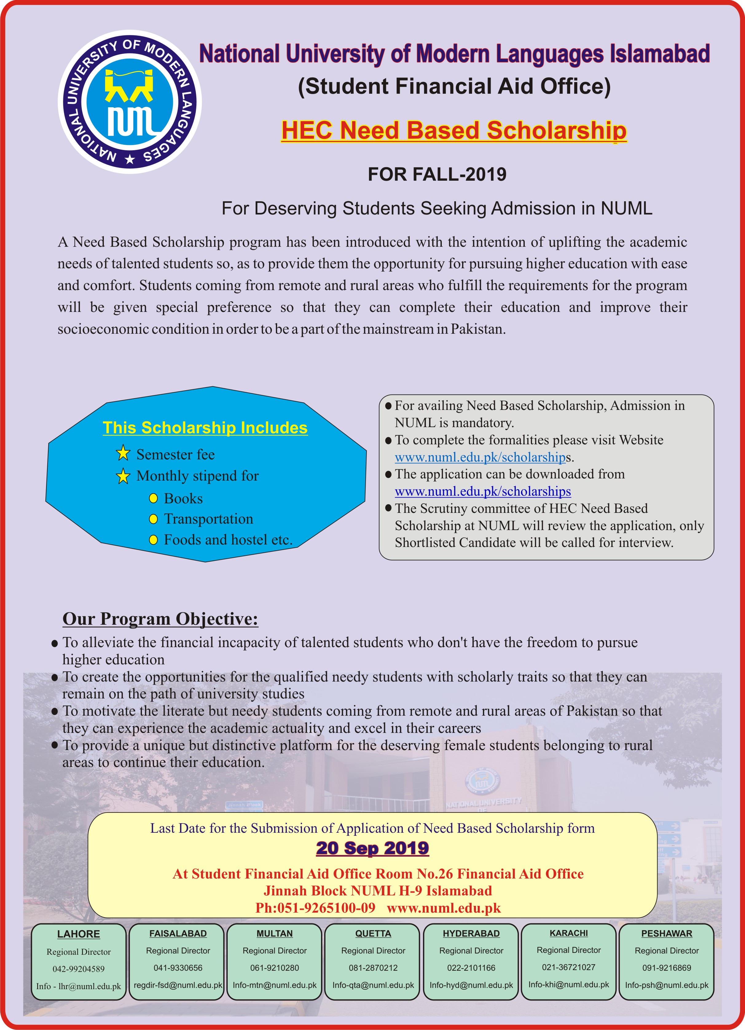 - Students of Regional Campuses of NUML can also apply in Need Based Scholarship through campuses on due date